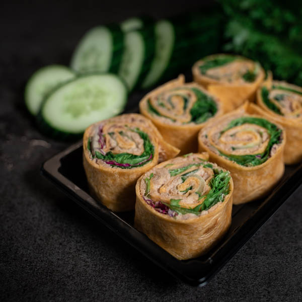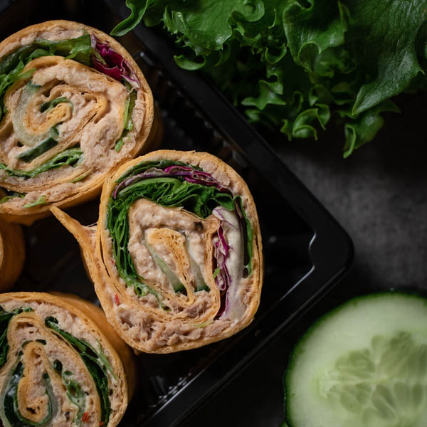 Suosittu tonnikalawrap sormisyötävinä paloina. Wrap pitää sisällään tonnikalatäytettä, tuorekurkkua sekä salaattisekoitusta
