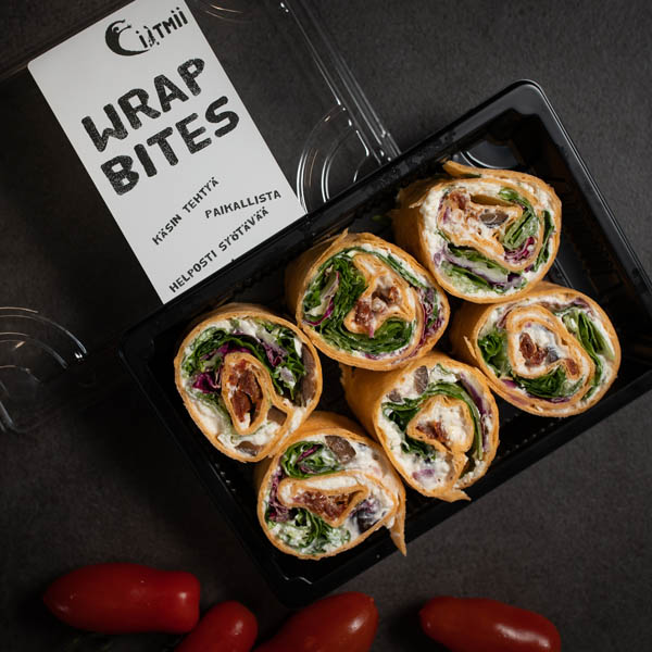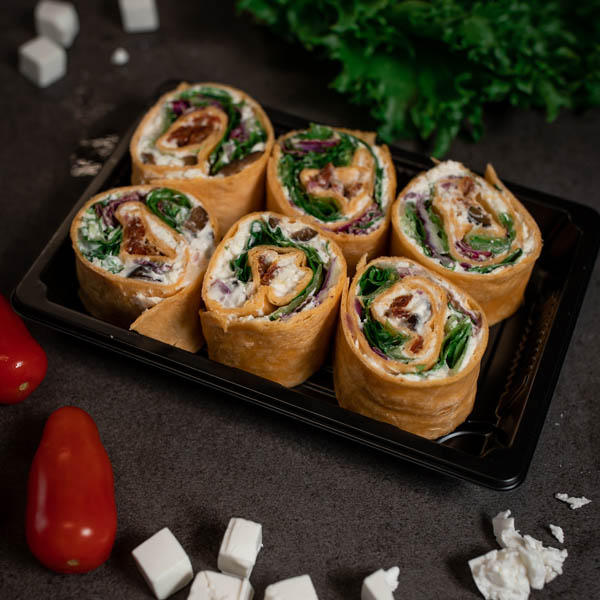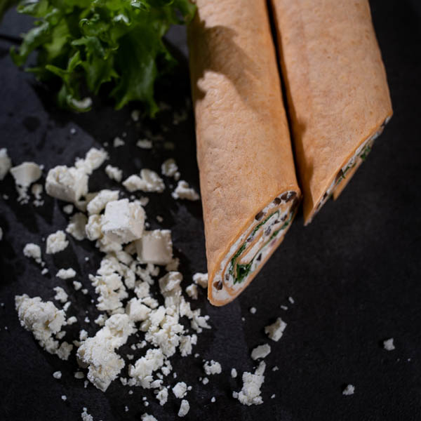 Wrap, jossa välimerellisestä juustosta valmistettu täyte, jossa mukana oliivia, punasipulia ja mausteita. Lisänä salaattisekoitusta, sekä aurinkokuivattua tomaattia.